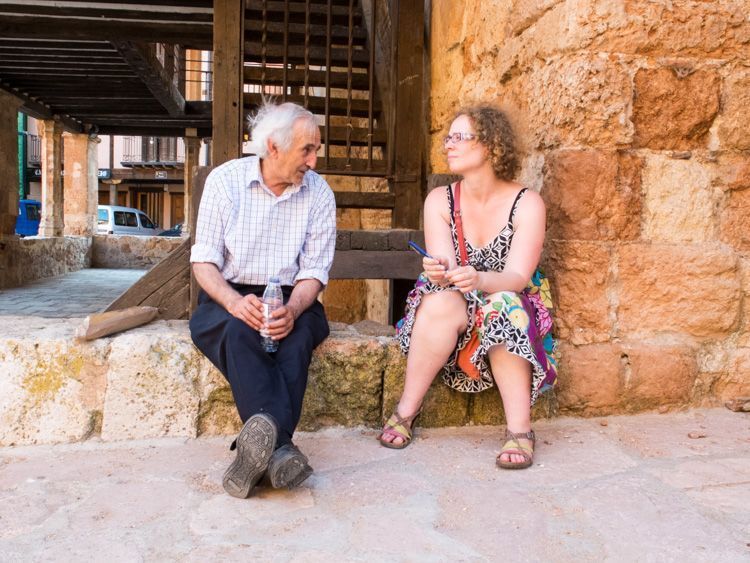 En Ayllón me reecontré y charlé con familiares, vecinos y primos lejanos (generé un debate delante de la casa familiar en el que participaron todos los vecinos de la plaza). En la segunda y tercera foto me ves esperando al párroco local dos días seguidos, la primera vez se me escapó, no tengo una explicación científica sobre cómo lo hizo, y en la segunda logré concretar con él una forma de acceder de nuevo a los libros parroquiales (siempre hay partidas que leer con detenimiento en vivo y en directo).